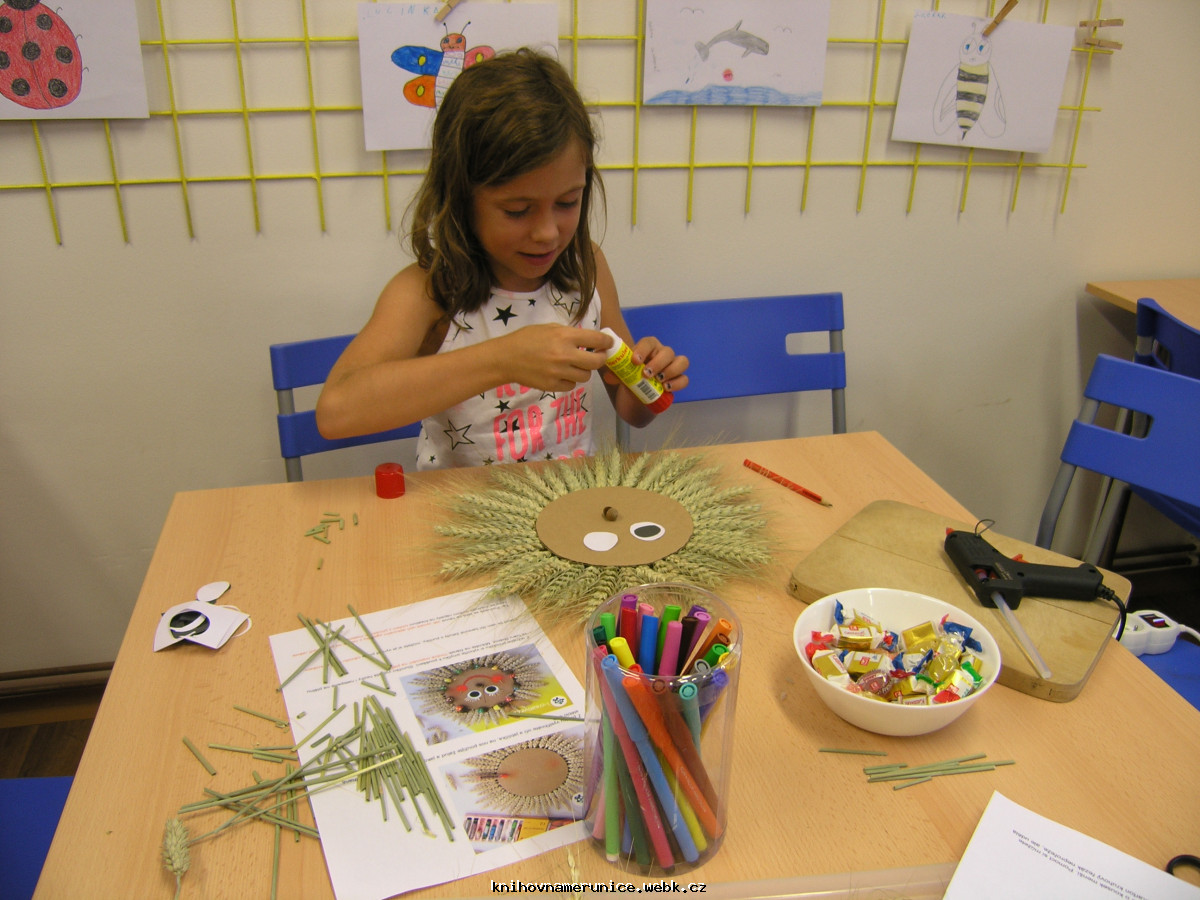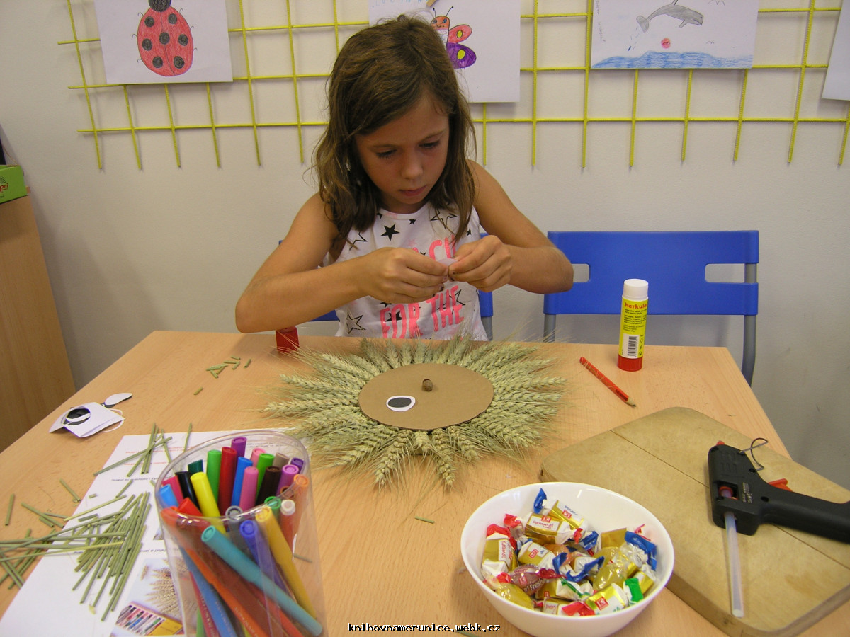 15. srpna vyráběly děti z klasů pšenice podzimní sluníčko. Z papírové krabice vystřihly slunce a z klasů vytvořily paprsky. Sluníčko vypadalo moc krásně.