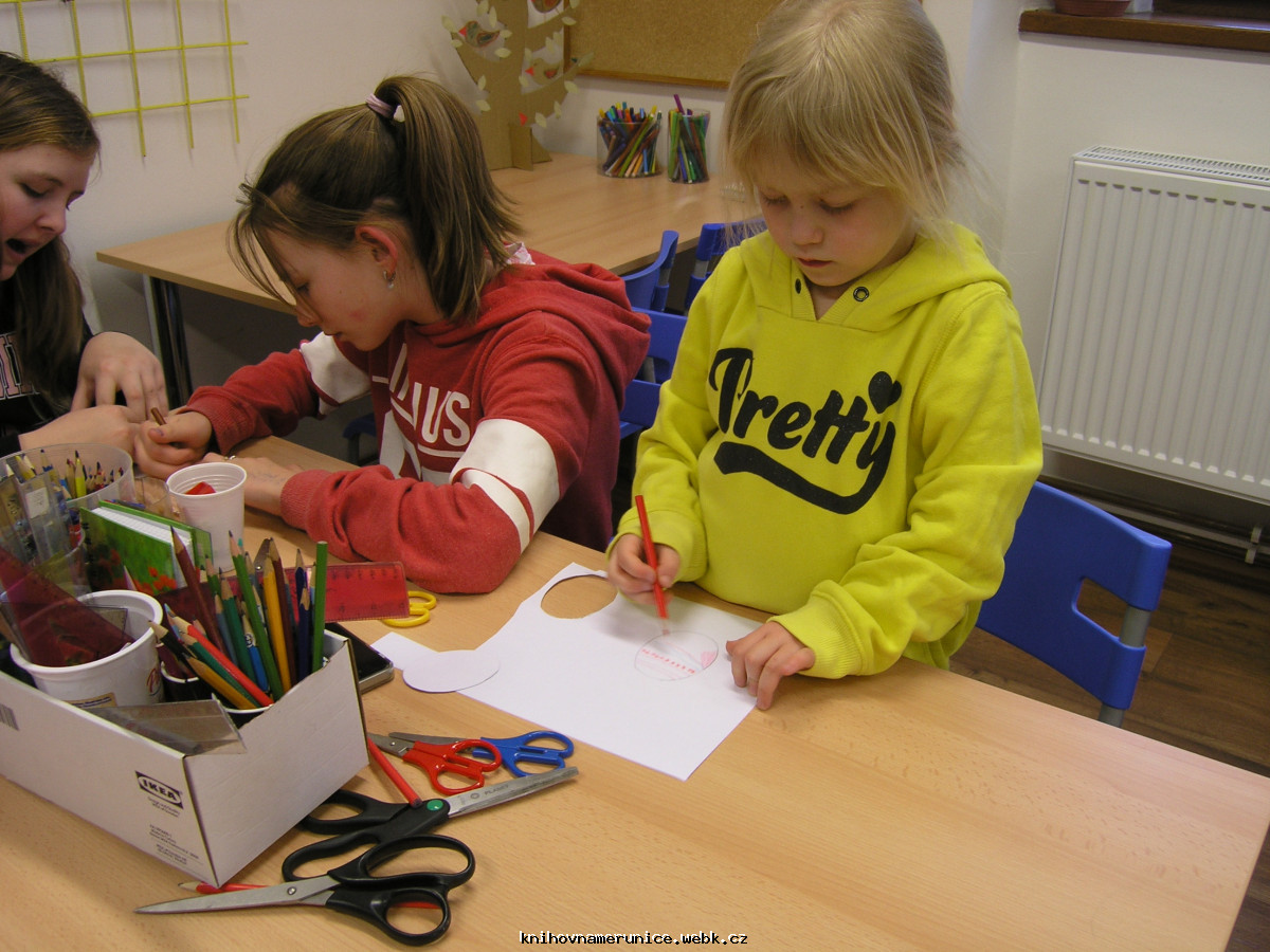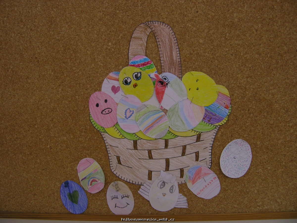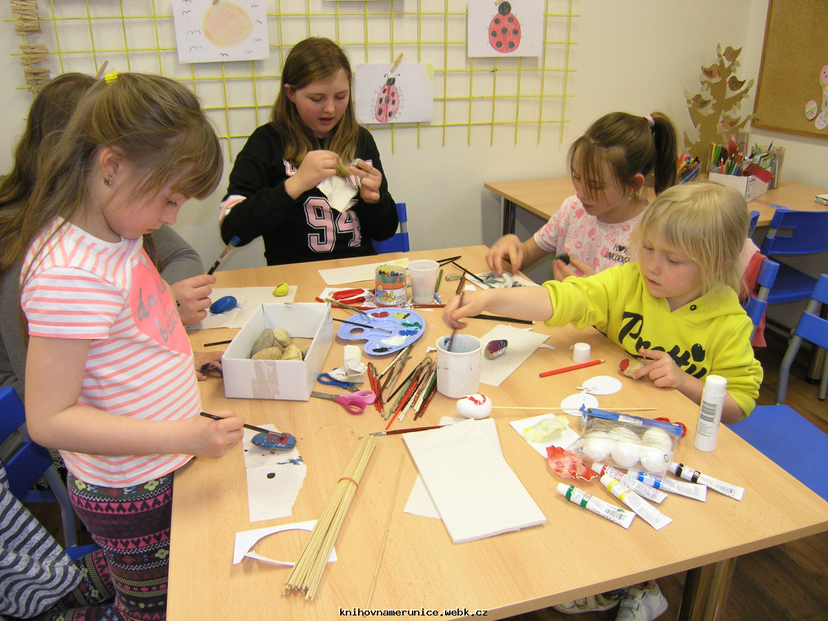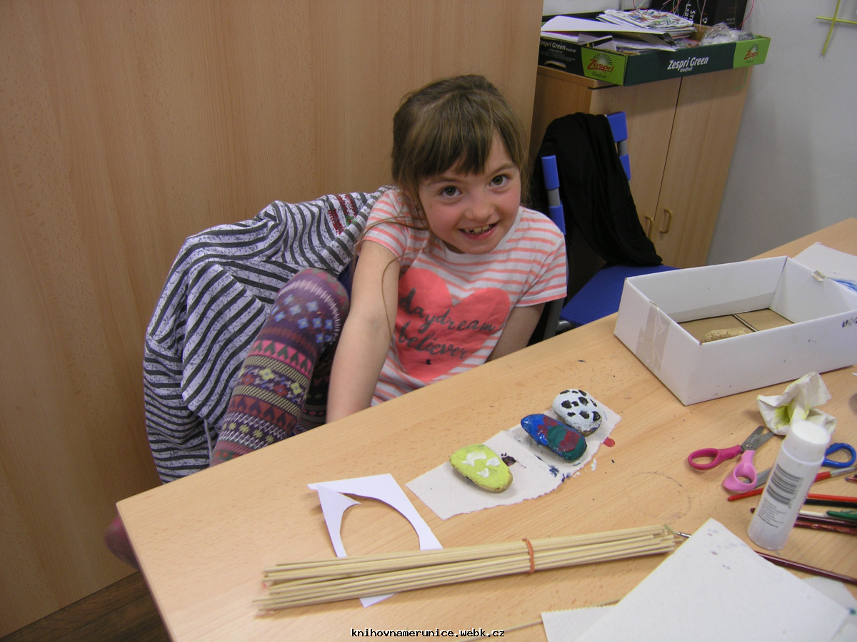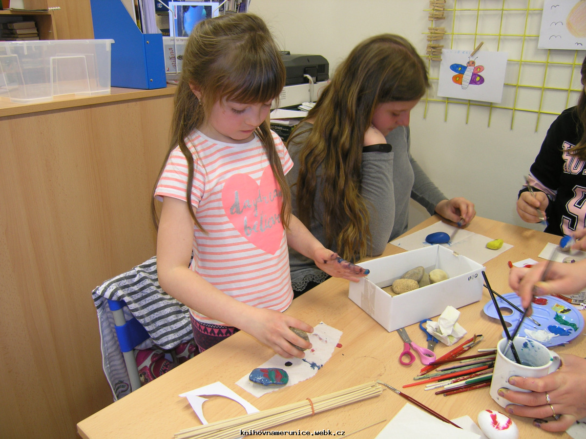 10. dubna opět děti vyráběly. Na výzdobu knihovny namalovaly velký košík a do něj spoustu barevných vajíček. Temperami malovaly kameny. Vytvořily několik berušek, ale většina kamenů dostala pestrobarevný nátěr.