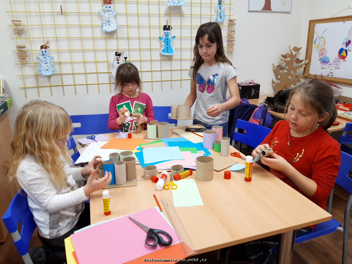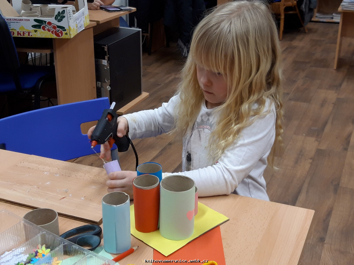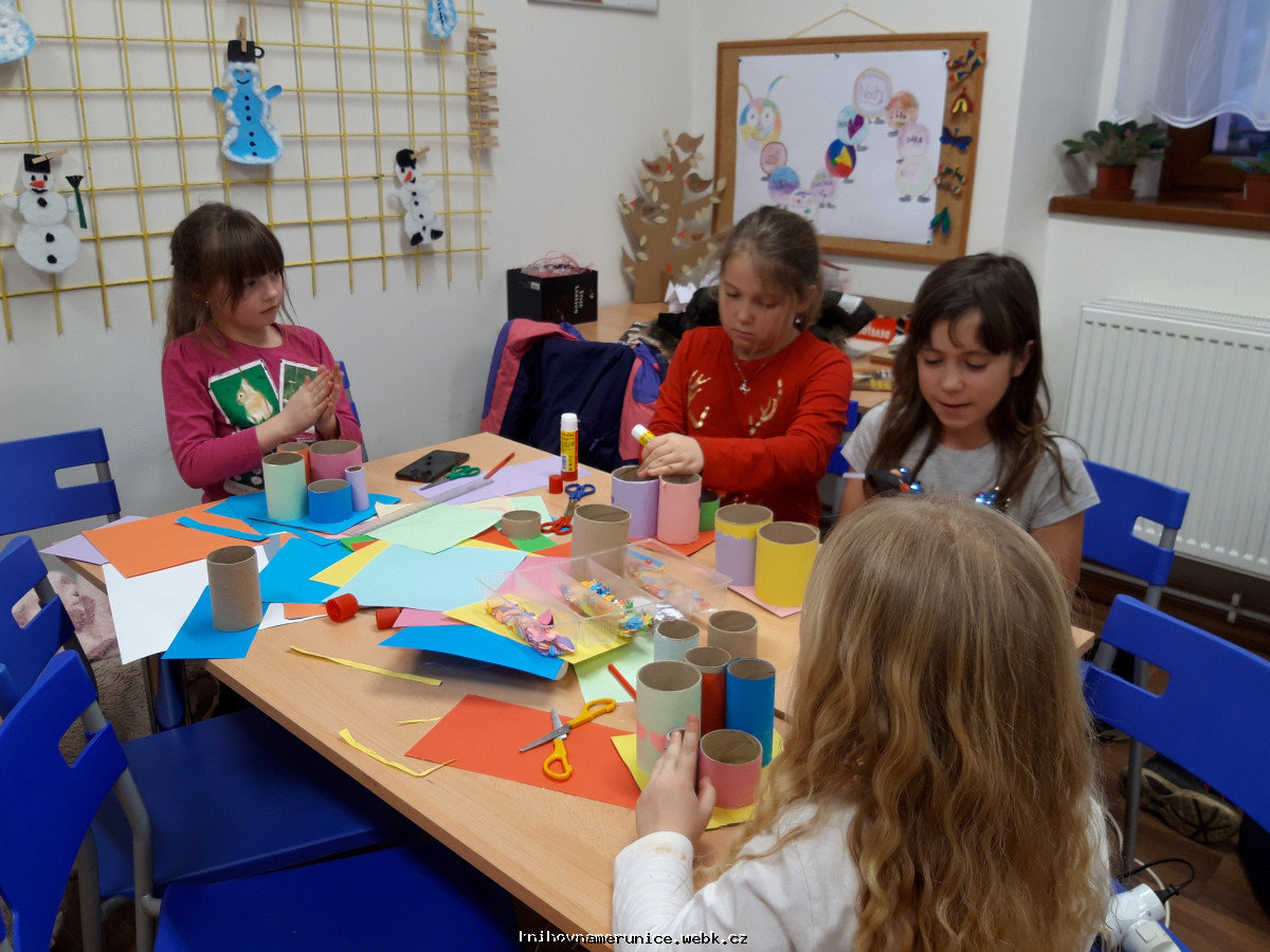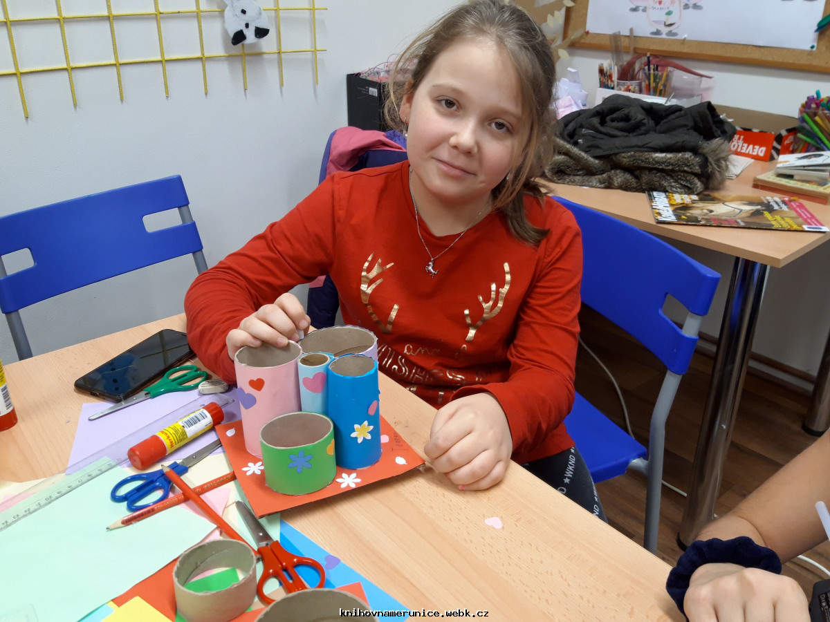 29. ledna si děti vyrobily krásný barevný stojan na tužky. Na ruličky z toaletního papíru nalepily barevný papír. Ruličky pomocí tavné pistole připevnily na tvrdý karton a ještě stojan ozdobily srdíčky a kytičkami.