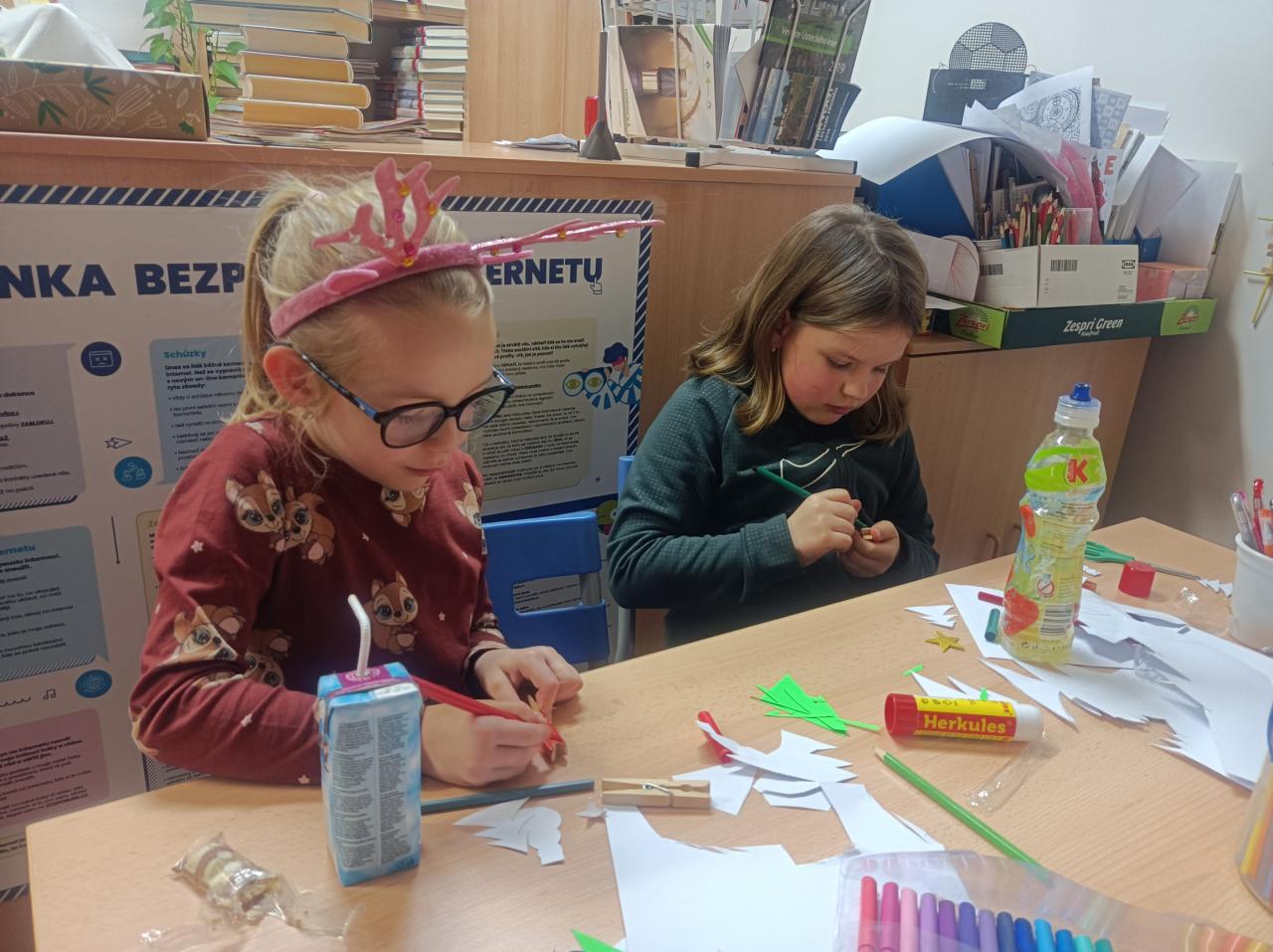 Dnes děti v knihovně vyráběly různé vánoční stromečky a malovaly obrázky na výzdobu knihovny.