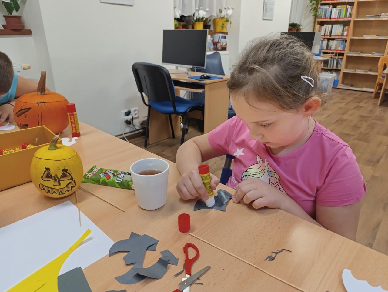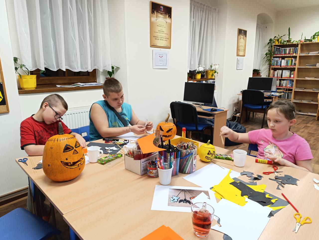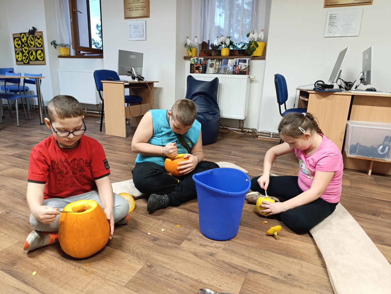 Dnes si děti v knihovně vyřezaly dýně na Halloween. Vytvořily si i strašidelné zápichy.