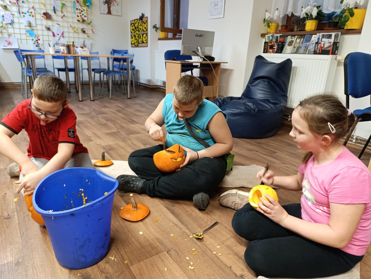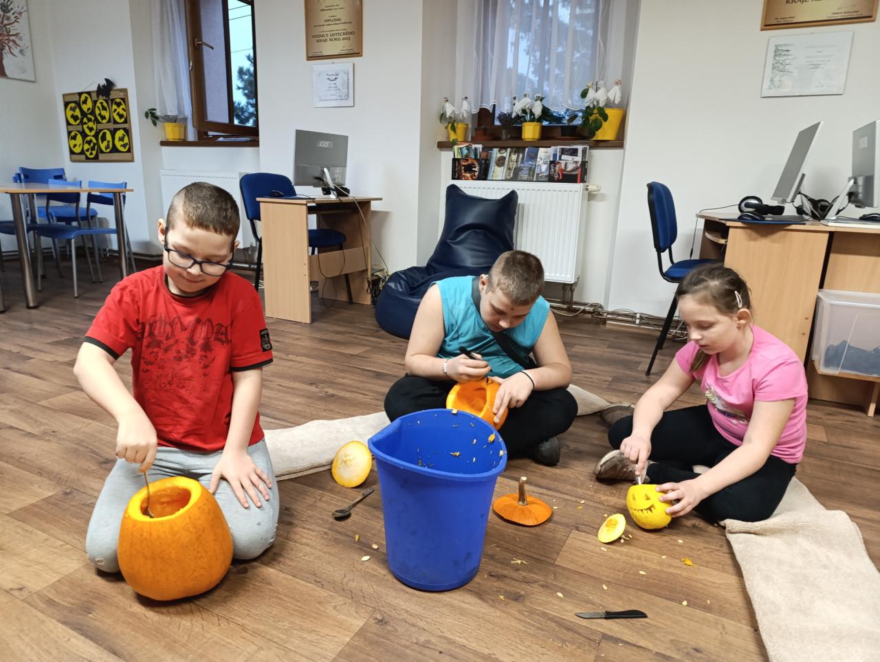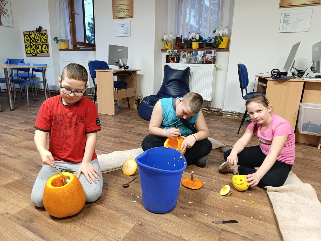 Dnes si děti v knihovně vyřezaly dýně na Halloween. Vytvořily si i strašidelné zápichy.