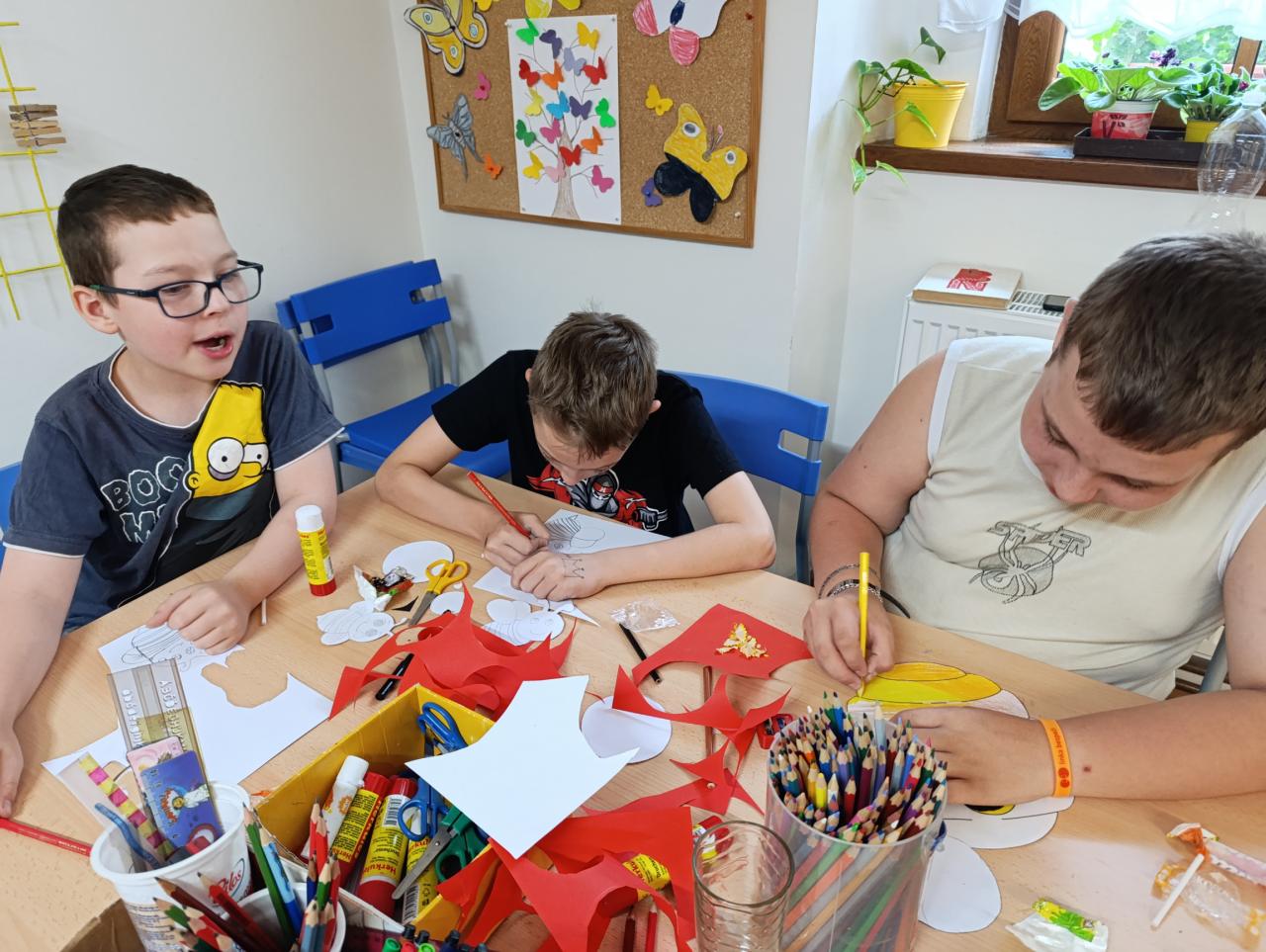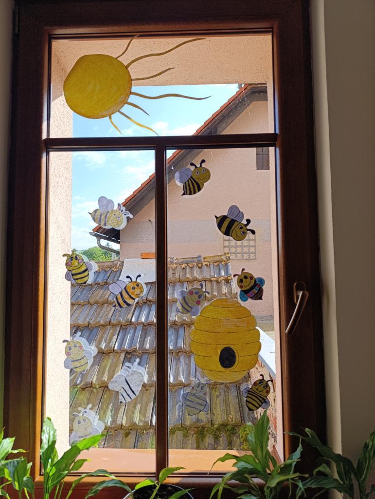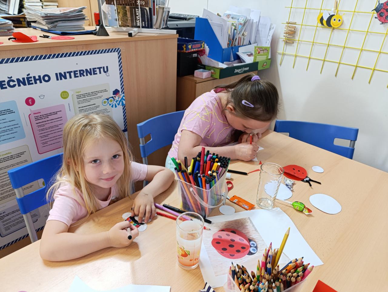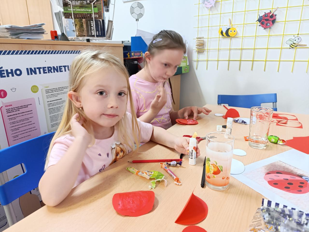 Děti namalovaly úl a plno včeliček na výzdobu knihovny. Vytvořily i několik berušek.